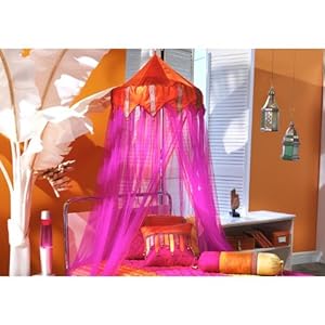 Size: 22 dia x 96 inches with richly gathered netting. Cordinated with Bohemian bedding with embroidered top cap with gold thread. 100% polyester top with nylon netting fabric. Please keep the fabrics away from the light sources as well as electrical gazettes.